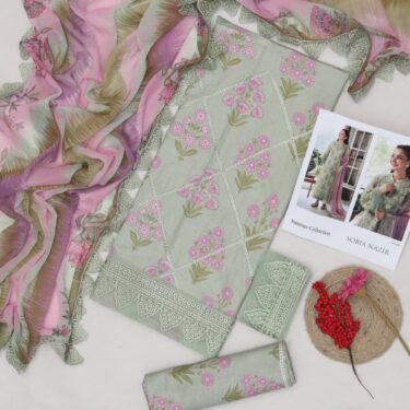 Summer Collection 2026 Printed Lawn 3PC Suit with Heavy Embroidered Sleeves & 4-Side Embroidered Chiffon Dupatta