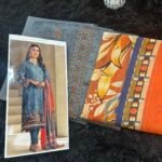Slate Blue 3-Piece Unstitched Collection – Floral Embroidered Shirt, Sunset Orange Printed Dupatta, and Dyed Trousers